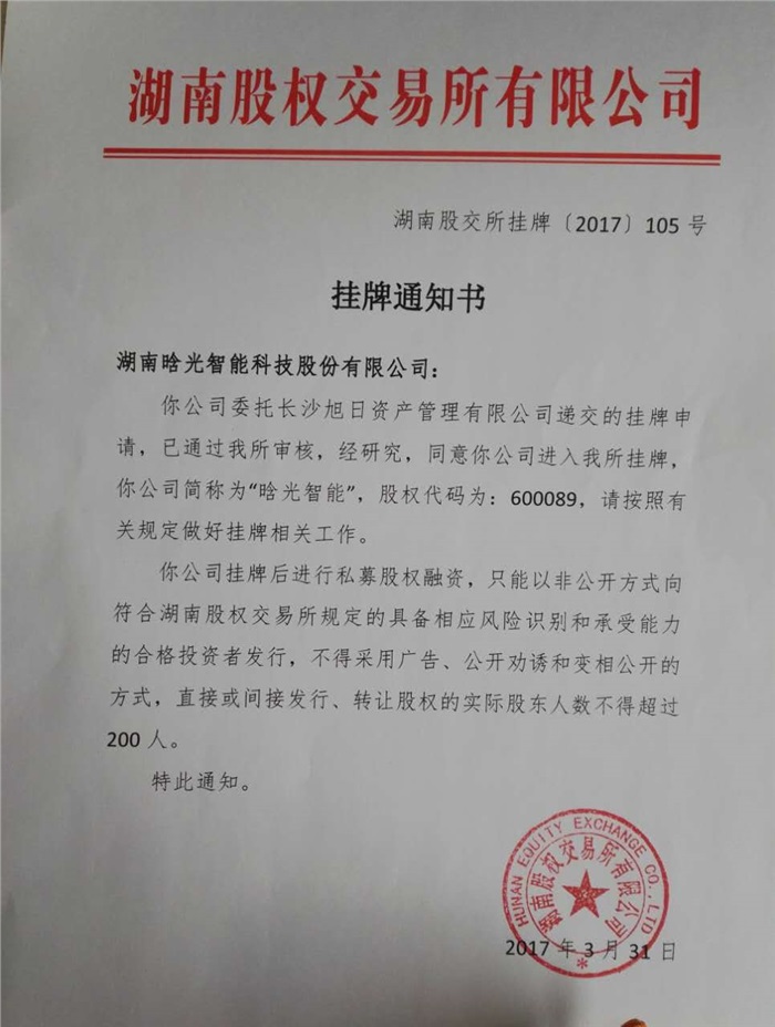 湖南晗光智能科技股份有限公司于3月31日在湖南股權(quán)交易所成功掛牌四板(標準版),掛牌儀式擇日舉行。